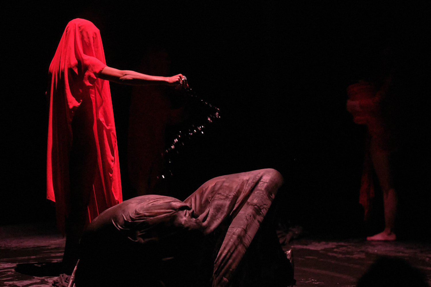 A ritual performance shows bodies engaging in the metamorphoses of space and self, rupturing with violent change, and imbibed into membrane as geometric choreography. A collapse, merging, and final discarding.